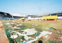 കൊറിയയില് നിന്ന് കൊണ്ടു വന്ന പച്ചപുല്ല് കരിഞ്ഞ് ഇല്ലാതായ മൈതാനത്ത് മത്സരം നടക്കുമ്പോള് ഉയരുന്നത് പൊടിയാണ്. ഏഴ് വര്ഷം മുമ്പ് സ്റ്റേഡിയം നവീകരിച്ച് തുറക്കുമ്പോള് ആരും ദുഃസ്വപ്നങ്ങളില്പ്പോലും കാണാത്ത കാഴ്ചയാണിപ്പോള് സ്റ്റേഡിയം കളിയാസ്വാദകര്ക്ക് നല്കുന്നത്.